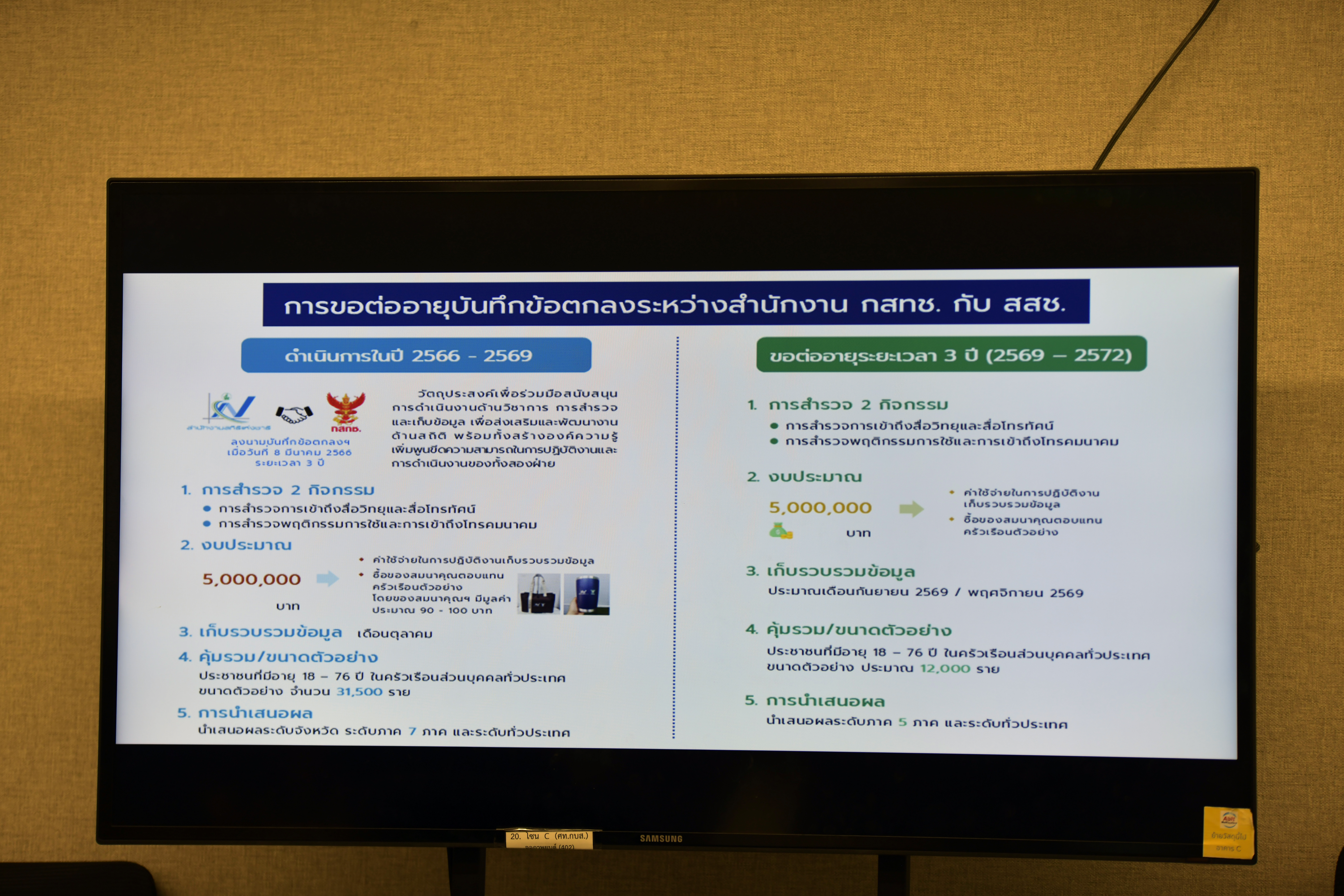 / สำนักงานสถิติแห่งชาติ ร่วมกับ สำนักงาน กสทช. ประชุมหารือการขอต่ออายุบันทึกข้อตกลงระหว่างสำนักงานคณะกรรมการกิจการกระจายเสียง กิจการโทรทัศน์ และกิจการโทรคมนาคมแห่งชาติ กับ สำนักงานสถิติแห่งชาติ