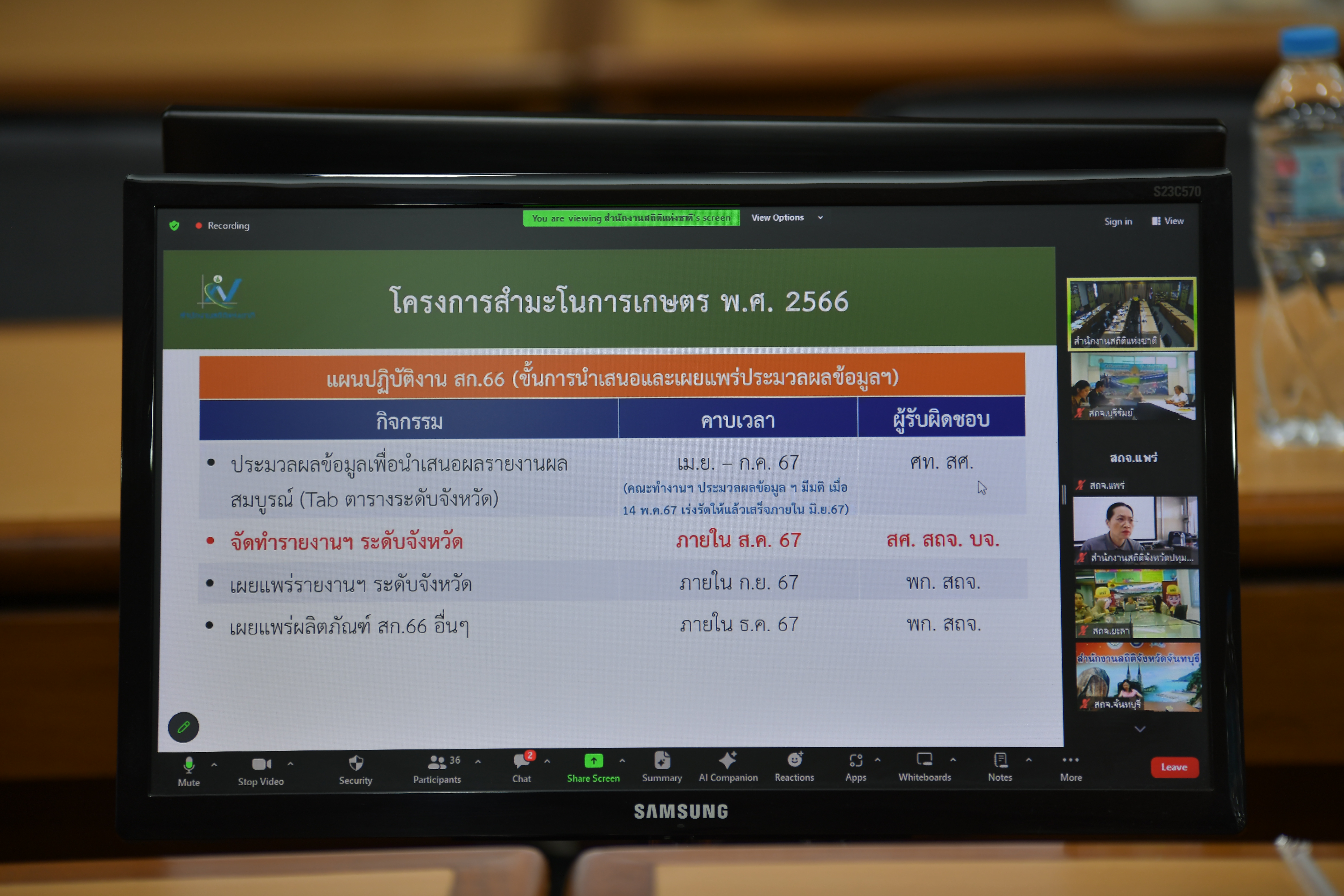 วันอังคารที่ 25 มิถุนายน 2567 นายพินิจ กัลยาณมณีกร รองผู้อำนวยการสำนักงานสถิติแห่งชาติ เป็นประธานการประชุมชี้แจงการจัดทำรายงาน ผลสำมะโนการเกษตร พ.ศ.2566 ฉบับสมบูรณ์ ระดับจังหวัด ครั้งที่ 1/2567 (จังหวัดกลุ่มที่ 1 ) ได้แก่ นนทบุรี ปทุมธานี อ่างทอง สระบุรี ระยอง จันทบุรี ตราด กาญจนบุรี สุพรรณบุรี สมุทรสงคราม เพชรบุรี ประจวบคีรีขันธ์ นครราชสีมา บุรีรัมย์ ชัยภูมิ อุตรดิตถ์ แพร่ กำแพงเพชร เพชรบูรณ์ กระบี่ ระนอง ยะลา ผ่านระบบ Zoom meeting ณ ห้องประชุม 401 ชั้น 4 สำนักงานสถิติแห่งชาติ หลักสี่ แจ้งวัฒนะ กรุงเทพฯ