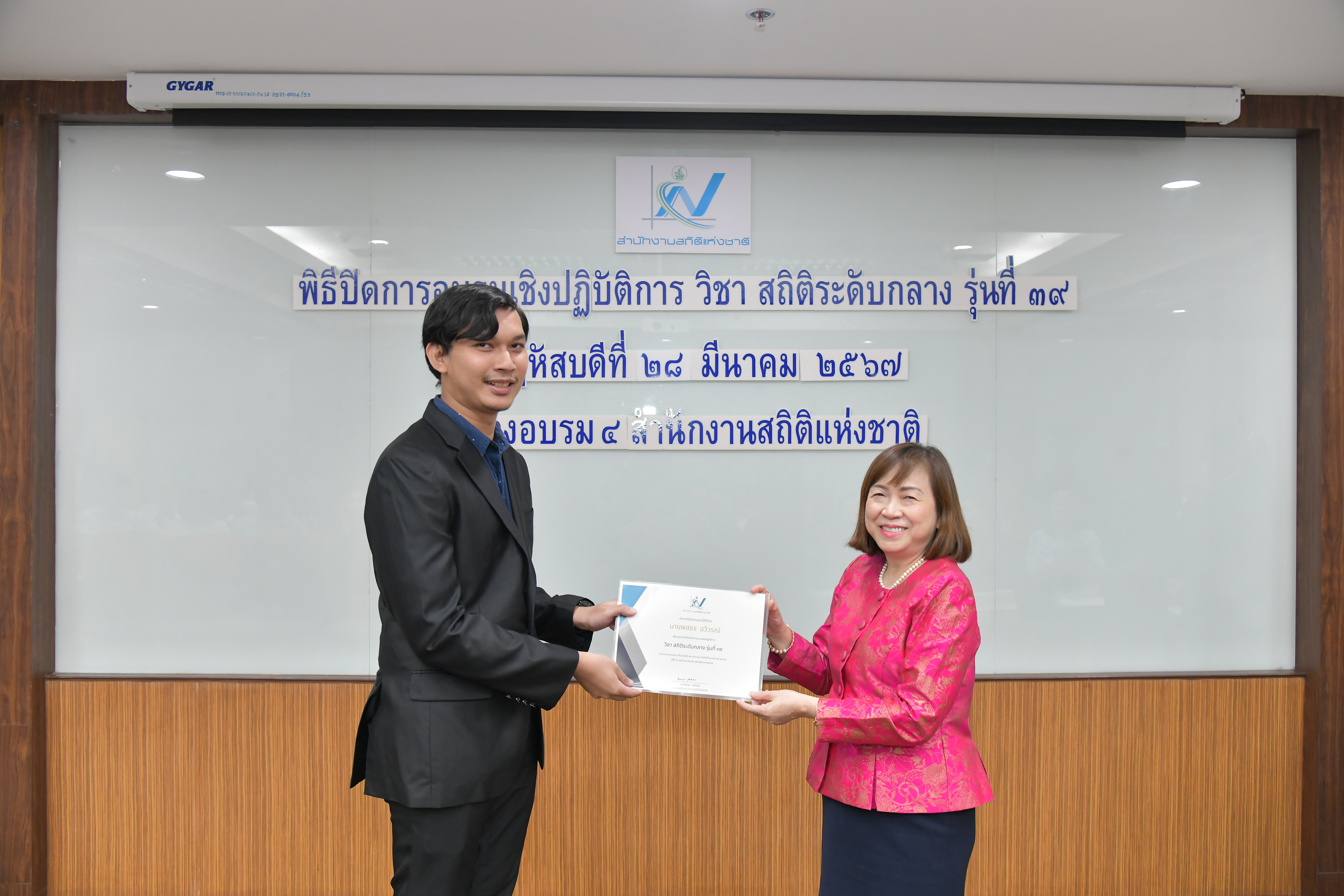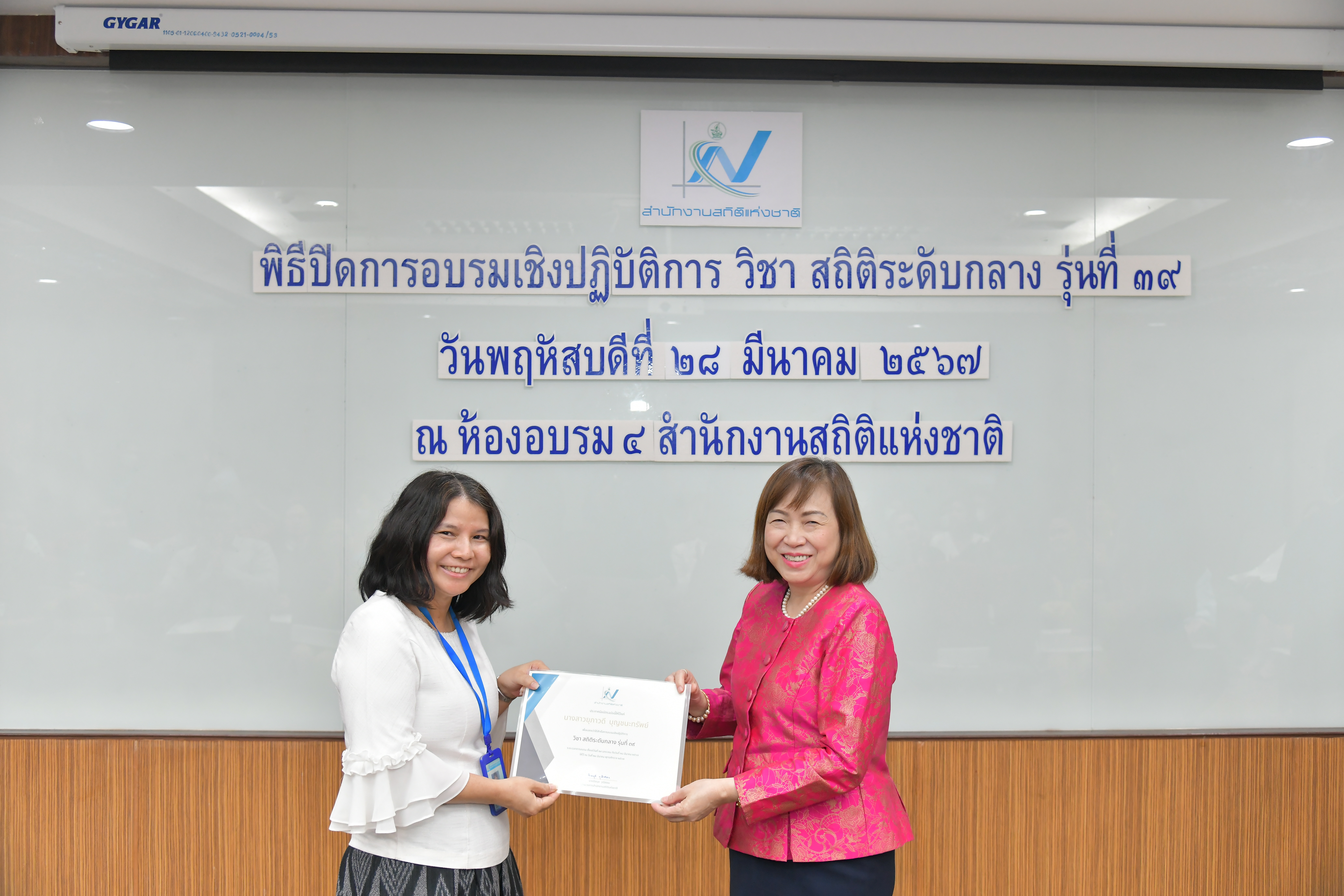 วันพฤหัสบดีที่ 28 มีนาคม 2567 นางสาวสุวรรณี วังกานต์ รองผู้อำนวยการสำนักงานสถิติแห่งชาติ เป็นประธานพิธีปิดการอบรมปฏิบัติการ และมอบประกาศนียบัตรแก่ผู้จบหลักสูตร วิชาสถิติระดับกลาง รุ่นที่ 39 ณ ห้องอบรม 4 สำนักงานสถิติแห่งชาติ (ทิศใต้) แจ้งวัฒนะ กรุงเทพฯ