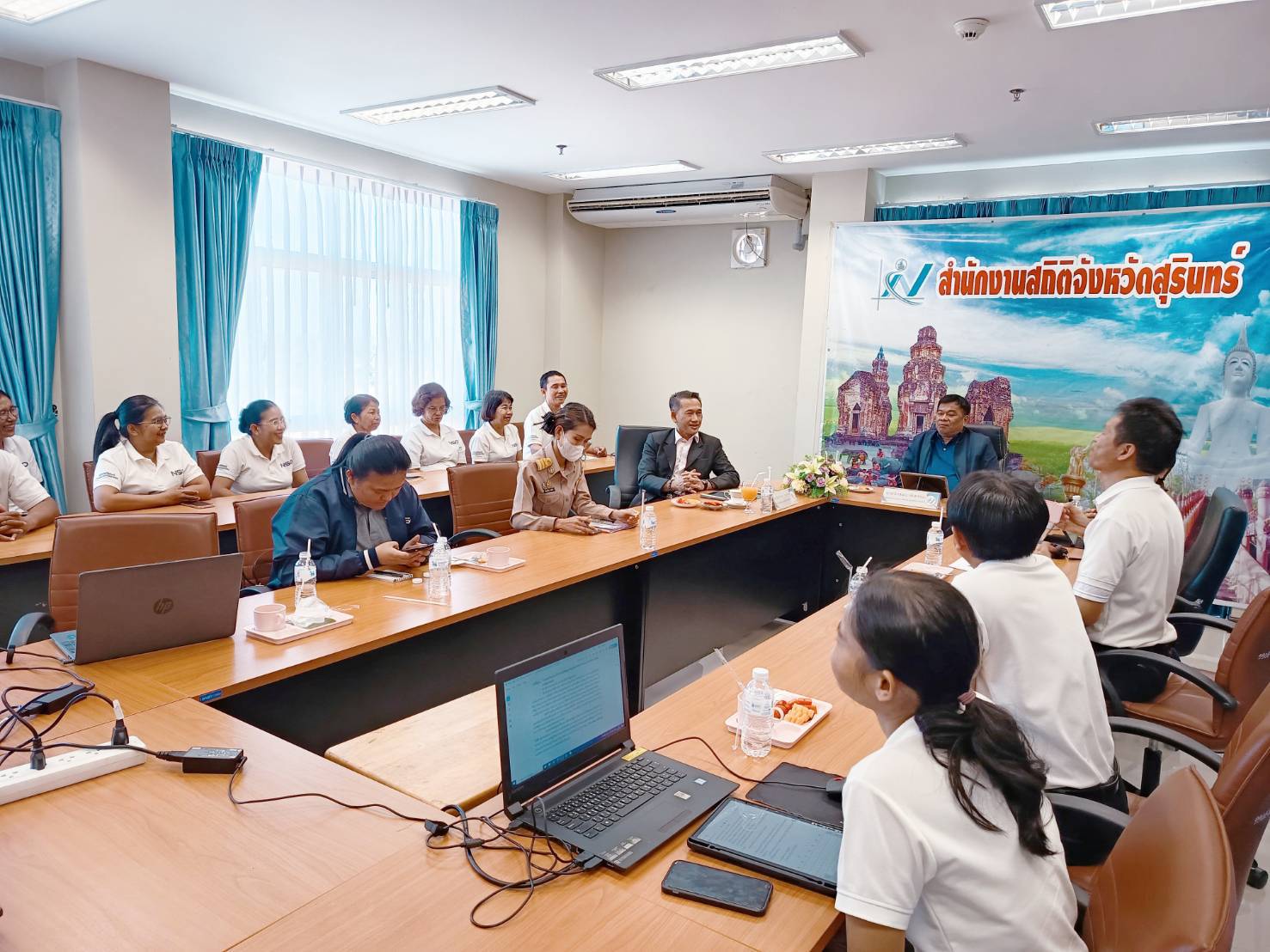 วันที่ 25 กุมภาพันธ์ 2568 นายจำลอง เก่งตรง รองผู้อำนวยการสำนักงานสถิติแห่งชาติ พร้อมด้วยนายประสาทสุข อุปัชฌาย์ และคณะฯ เดินทางไปตรวจราชการ ณ จังหวัดสุรินทร์ ตามแผนการตรวจราชการสำนักงานสถิติแห่งชาติ ปีงบประมาณ พ.ศ. 2568 และติดตามการดำเนินงานภายใต้โครงการส่งเสริมและสนับสนุนการขับเคลื่อนการพัฒนาดิจิทัลในระดับจังหวัดและอำเภอ เข้าตรวจเยี่ยมสำนักงานสถิติจังหวัดสุรินทร์ ประชุมรับฟังผลการปฏิบัติงานตามขอบเขตตรวจราชการ รับฟังปัญหาอุปสรรค แนวทางแก้ไขพร้อมให้คำแนะนำในการดำเนินการ จากนั้นลงพื้นที่จำนวน 2 ศูนย์ ดังนี้
