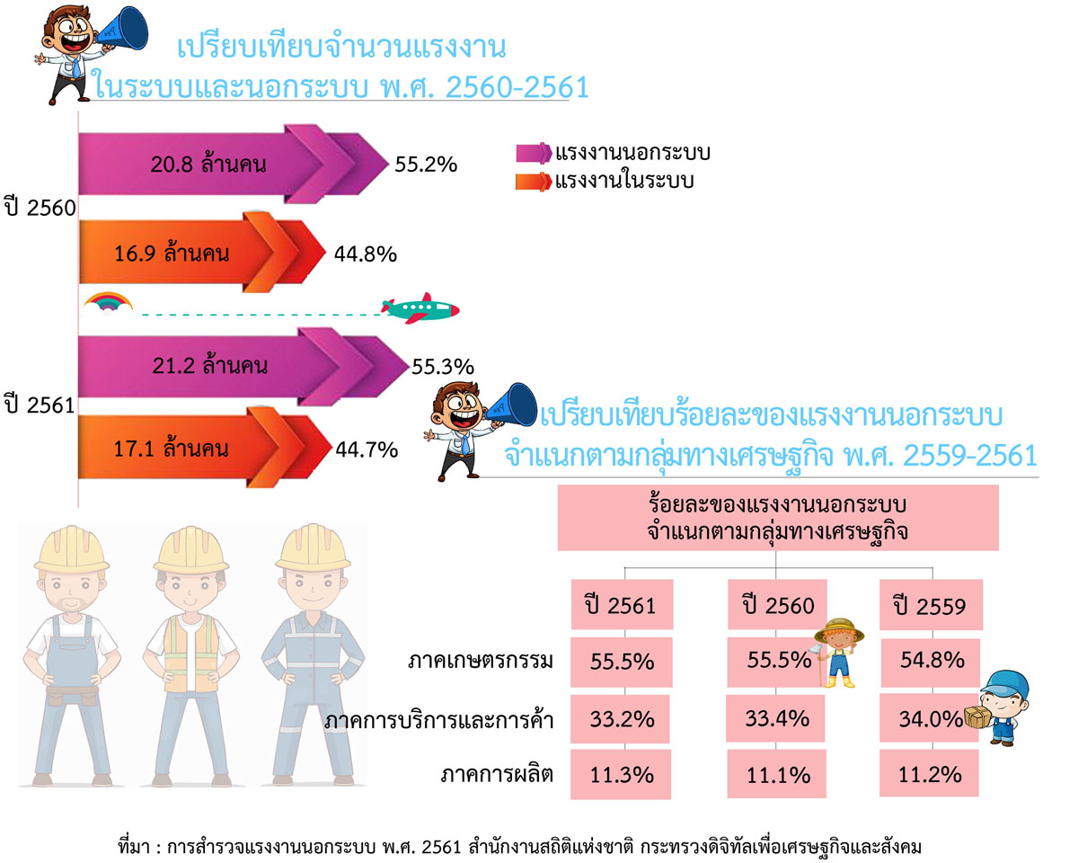 นายภุชพงค์ โนดไธสง ผู้อำนวยการสำนักงานสถิติแห่งชาติ เปิดเผยผลการสำรวจแรงงานนอกระบบ 2561 พบว่า แรงงานนอกระบบมีแนวโน้มเพิ่มขึ้นจาก 20.8 ล้านคน ในปี 2560 เป็น 21.2 ล้านคน ในปี 2561 โดยมีแรงงานนอกระบบร้อยละ 55.5 ทำงานอยู่ในภาคเกษตรกรรม รองลงมาเป็นภาคการบริการและการค้าร้อยละ 33.2 และภาคการผลิต ร้อยละ 11.3 ตามลำดับ เมื่อพิจารณาถึงปัญหาของแรงงานนอกระบบปี 2561 พบว่า เป็นผู้มีปัญหาจำนวน 6.7 ล้านคน หรือร้อยละ 31.6 ของแรงงานนอกระบบทั้งหมด โดยมีปัญหาจากการทำงานร้อยละ 73.1 จากสภาพแวดล้อมในการทำงาน ร้อยละ 46.3 และความไม่ปลอดภัยในการทำงานร้อยละ 40.3 จากผลการสำรวจพบว่า ในจำนวนผู้มีงานทำทั้งสิ้น 38.3 ล้านคน เป็นแรงงานนอกระบบ 21.2 ล้านคน หรือร้อยละ 55.3 ซึ่งคนกลุ่มนี้เป็นผู้ทำงานแต่ไม่มีหลักประกันสังคมใดๆ ที่ได้จากการทำงาน ซึ่งผลการสำรวจแรงงานนอกระบบเป็นผู้ทำงานที่มีการศึกษาไม่สูงนักและทำงานในภาคเกษตรกรรมเป็นส่วนใหญ่ และยังพบอีกว่ารายได้ที่ได้รับค่อนข้างน้อย ซึ่งภาครัฐจำเป็นต้องเข้ามาดูแลเป็นพิเศษเพื่อสร้างโอกาสหรือชดเชยด้านสวัสดิการสังคมจากการทำงานให้ดีขึ้น ทั้งนี้หากแรงงานนอกระบบเหล่านี้ไม่ได้รับความช่วยเหลือ และสร้างโอกาสให้ดีขึ้น เมื่อมีอายุมากขึ้นจะส่งผลกระทบต่อสังคมในอนาคตต่อไป พบกับข้อมูลเพิ่มเติมได้ที่เว็บไซต์ www.nso.go.th นายภุชพงค์ฯ กล่าว