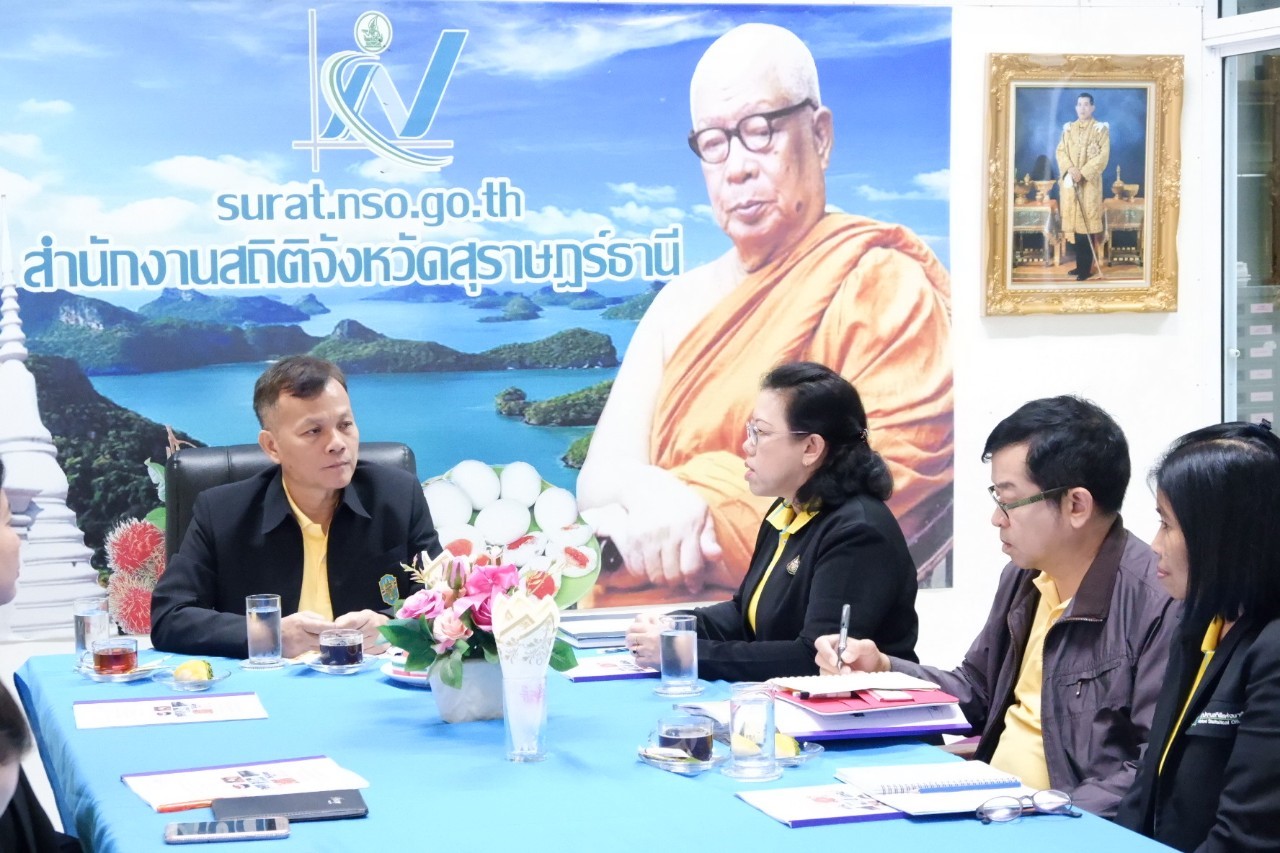 เมื่อวันที่ 16 พฤษภาคม 2562 นายภุชพงค์ โนดไธสง ผู้อำนวยการสำนักงานสถิติแห่งชาติ พร้อมด้วยนายสมเกียรติ ศิริวัฒนโชค ผู้เชี่ยวชาญพิเศษ ด้านการพัฒนาคุณภาพการเก็บรวบรวมข้อมูล และคณะฯ เดินทางไปตรวจเยี่ยม และมอบนโยบายการปฏิบัติงาน ณ สำนักงานสถิติจังหวัดสุราษฎร์ธานี โดยมี นางพรทิพย์ โพธิครูประเสริฐ สถิติจังหวัดสุราษฎร์ธานี พนักงานและเจ้าหน้าที่ให้การต้อนรับและร่วมประชุม พร้อมกันนี้ นายสมเกียรติ ศิริวัฒนโชค ผู้เชี่ยวชาญพิเศษ ด้านการพัฒนาคุณภาพการเก็บรวบรวมข้อมูล และคณะฯ ได้ลงพื้นที่สังเกตการณ์การปฏิบัติงาน เก็บรวบรวมข้อมูลของเจ้าหน้าที่เก็บรวบรวมข้อมูล (FI) หรือ “คุณมาดี” ในเขตปฏิบัติงานพื้นที่ เทศบาลตำบลวัดประดู่ อำเภอเมือง จังหวัดสุราษฎร์ธานี และสร้างความรับรู้เข้าใจสู่ประชาชนเกี่ยวกับการจัดทำโครงการระบบการจัดเก็บข้อมูลโครงสร้างพื้นฐานระดับพื้นที่ เพื่อการบริหารจัดการทรัพยากรน้ำอย่างยั่งยืนในลุ่มน้ำทั่วประเทศ จำนวน 25 ลุ่มน้ำ (โครงการระยะที่ 1) จังหวัดสุราษฎร์ธานี
